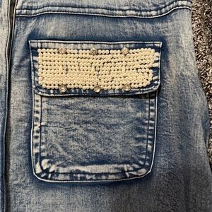 Vocal Stylish denim sweater top with button-down front. Features gray knit sleeves. Embellished pockets add flair. Made in USA size Small