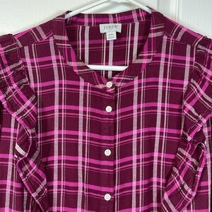 J Crew Plaid Checkered L/S Bohemian Victorian Maroon Blouse XXL EUC #1133
