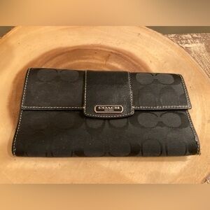 This Coach Signature Trifold Longer Wallet is a stylish and functional accessory for women. It features a black canvas fabric with a pink leather interior, and is adorned with a zipper and Coach logo accents. The wallet has a longer style and is perfect for credit card and folding storage.