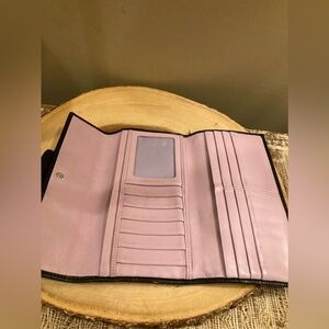 Coach Signature, Trifold Longer Wallet Black Print Pink  Leather Interior.