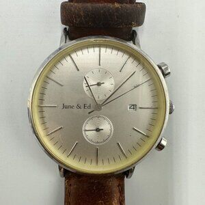 June & Ed Chronograph Watch Men Silver Tone 41MM Dial Date Window New Battery