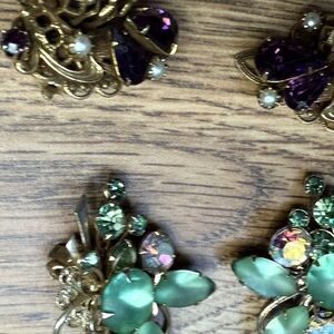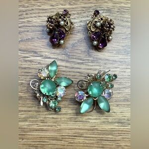 2 Pair Vintage Clip on Earring Sets Elegant Gold and Green, Purple & Gold