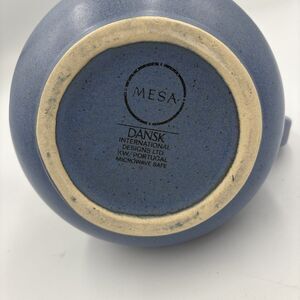 The DANSK Mesa Sky Blue 48oz Pitcher is a vintage stoneware piece from Portugal, showcasing a solid blue color with a round shape. This limited edition pitcher is part of the Mesa Blue Sky product line and features an Arts & Crafts/Mission Style design. Manufactured in 1990, this original piece of art pottery is perfect for adding a touch of American Southwest charm to your decor.