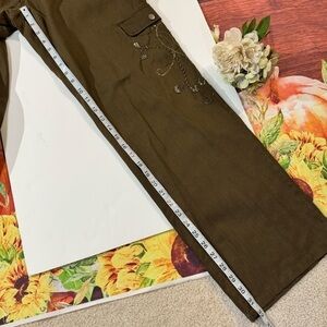 Classy cargo pants with bead and sequin embellished left side snap pocket. Two back snap pockets and two front open pockets.