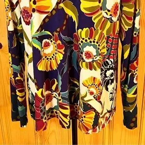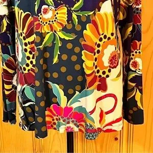 Bright floral print V-neck long sleeve top made from a comfortable blend fabric that has a little bit of stretch. Top has an A-line silhouette. In excellent like new condition. No stains or tears/holes.