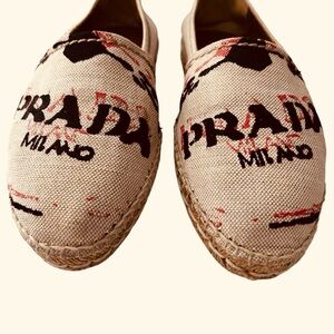 Chic Prada espadrilles with bold logo. Features Dark Red and black accents on cream canvas.