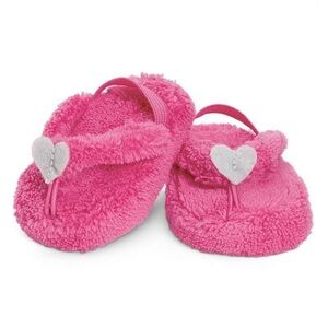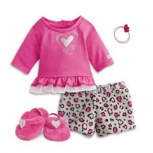 American Girl Lovely Leopard Pajamas for Dolls (Doll Not Included). Her doll will be ready for the "purr-fact" Slumber party! These pajamas feature: a pink knit top with a shimmery heart graphic on the front and a two-tiered ruffle at the hem fuzzy leopard-print shorts pink plush Slippers with hearts an elastic hairband adorned with glittery hearts. New in American Girl box. Scaled for 18 inch dolls.