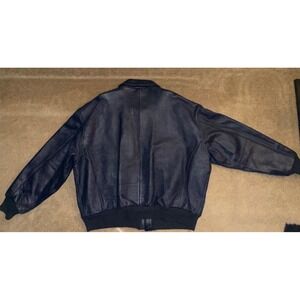 Classic JOHNNIE REDD genuine leather bomber jacket in good pre-owned condition. Dark blue leather with natural wear at the cuffs and sleeves (shown in photos), giving it a rugged, vintage look. Features a full zip closure, two large front flap pockets, ribbed cuffs/hem, and a comfortable polyester lining. Timeless bomber silhouette—perfect for casual wear, travel, or adding standout style to everyday outfits.