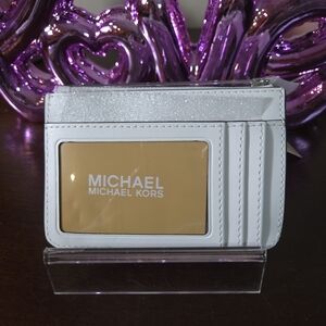 Elegant optic white quilted card holder. Features sleek design and Michael Kors logo.