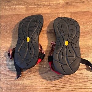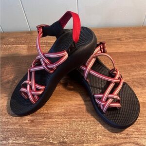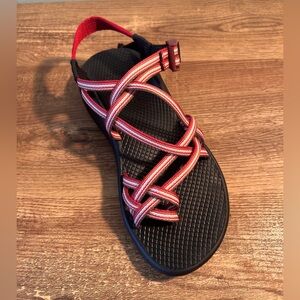 Comfortable and durable Chaco sport sandals designed for everyday wear, travel, and outdoor activities. Features adjustable crisscross webbing straps in red, pink, and white with a secure heel strap for a supportive fit. Textured footbed provides grip and all-day comfort.