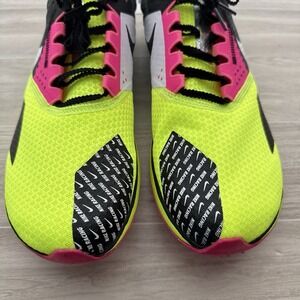Nike Rival Waffle track spikes in neon yellow black and pink. These performance shoes are designed for racing and feature a distinctive waffle sole for optimal traction. Ideal for track events and cross country competitions.