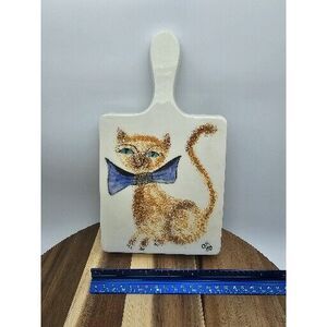 Vintage Handpainted Signed Cat In Bow Tie Ceramic Bread Board Trivet. One small chip shown in photos but still a charming piece.