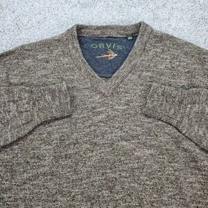 Keywords: Orvis sweater, mens V-neck sweater, wool sweater, fly fishing sweater, outdoor sweater, long sleeve sweater, brown sweater, beige sweater, mens clothing, classic sweater, embroidered sweater, warm sweater, casual sweater