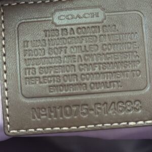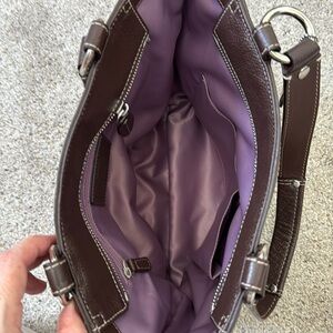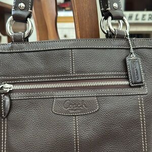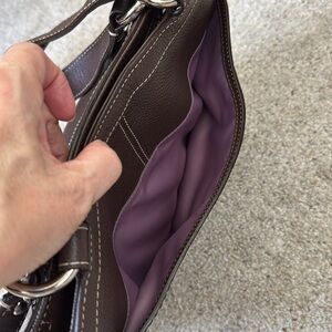 Coach Penelope shoulder bag in dark brown with contrast stitching, silver tone hardware, patent leather hangtag and zipper pulls, and purple sateen lining. Comes with an unbranded bag scarf for color. In excellent condition with no corner rubbing or stains. Two scratches on the back side, see last picture.
