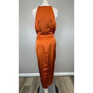 The RENI waist tie midi dress is stunning in colour and design. A dress with the sheen of an orange bronze metal and a silk finish. The keyhole delicately shapes the bust and mid riff that's comfortable to show.
