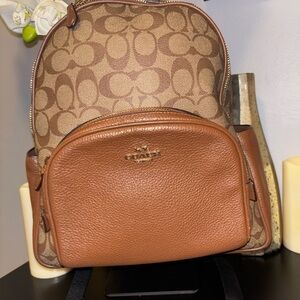 Elegant Coach backpack with signature pattern. Rich brown leather accents. Perfect for everyday use.