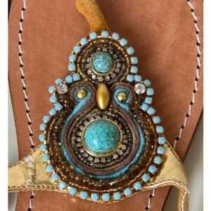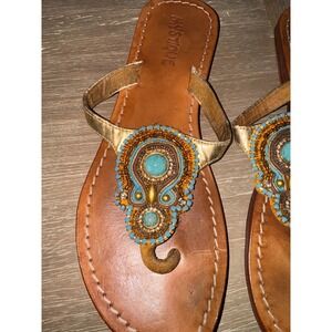 Keywords: Mystique sandals, beaded sandals, thong sandals, turquoise sandals, gold sandals, bohemian sandals, women's sandals, size 7 sandals, leather sandals, embellished sandals, beach sandals, summer footwear, casual sandals, vacation sandals