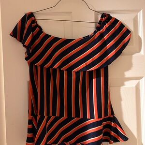 This elegant blouse from Banana Republic features a striking combination of pink/red and blue hues, enhanced by a ruffled off-the-shoulder design. Gently used. XS
