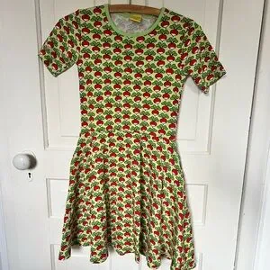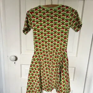 Vibrant dress with a playful radish print. Features a mix of red, green, and cream colors. Fits girls XL/women's size XS-S