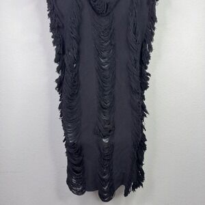 Statement-making Tulumniati open-front vest crafted in a textured black fabric with dramatic fringe detailing throughout. Longline silhouette with heavy movement and bold visual impact.