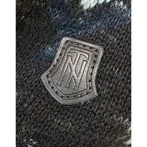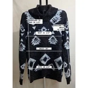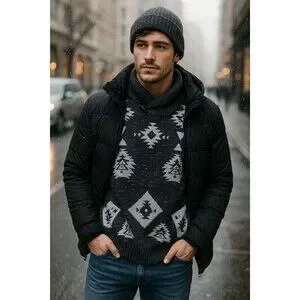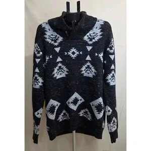 This cozy Trash Nouveau pullover features a bold black-and-gray Aztec knit pattern with a chunky ribbed shawl collar and a wood-tone toggle button detail. Made from soft 100% cotton, this sweater delivers both comfort and standout visual textureperfect for cold-weather layering and early-2000s indie/boho revival outfits.