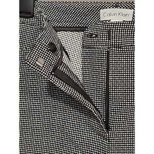 The Calvin Klein Pants for women in size 10 feature a sleek black and white dotted design, making them perfect for formal or dressy occasions. These 4-pocket pants have belt loops for added convenience. Made by the trusted brand Calvin Klein, these regular fit pants are ideal for all seasons and are machine washable for easy care. Perfect for the fashion-forward woman looking for a versatile and stylish addition to her wardrobe.