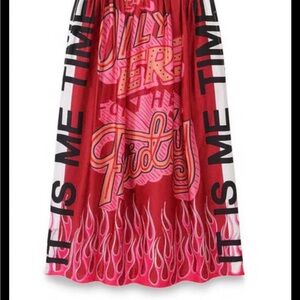 This is a Me369 Hailey printed midi skirt in 100% viscose satin with a "Fire" or "It's Me Time" graphic slogan print.