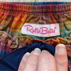 RuffleButts Storybook plaid shorts, girls size 0-3 months, pretty autumn harvest plaid, good sized navy grosgrain ribbon on back with signature ruffles, elastic at the waist and around legs for a cute bubble look, perfect for baby pictures, new with tags