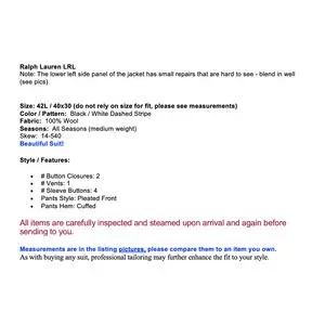 Ralph Lauren LRL Mens 42L 40x30 Black Stripe 2 Piece Suit Note