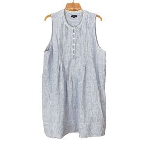 Quince European Linen Sleeveless Swing Dress Size XL Blue & White Stripe Pockets. Dress is in good preowned condition. 100% linen from flax sustainably grown in Western Europe. Lightweight. Two side-set pockets. Pintuck detail on bodice, and on the back below the yoke. Functional buttons.
