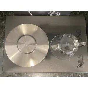 NWT Nespresso View Collection Cappuccino Cups and Saucers, Set of 2. Cups are clear glass and Saucer is silver.