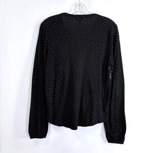 Keywords: Lucky Brand, boho top, embroidered shirt, polka dot top, button front shirt, long sleeve tee, black and white top, bohemian style floral, casual knit top, split neck top, peasant style shirt, cottagecore top