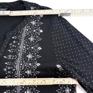 Lucky Brand long sleeve button-front top in black with a charming white polka dot and floral embroidery pattern. This lightweight knit shirt features a split V-neckline and a partial button placket with metallic buttons. The front is adorned with intricate vertical floral embroidery, while the sleeves and back showcase a classic micro-polka dot print. Crafted from a soft cotton-blend fabric, it offers a comfortable fit with a subtle bohemian flair.