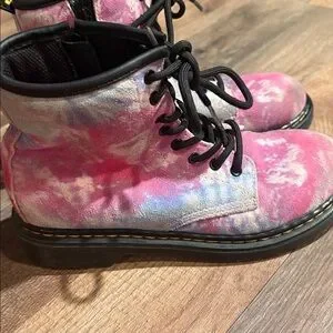 These feature a pink, purple & blue tie-dye finish with classic Doc Martens 8 hole lace up combat boot durable construction.
