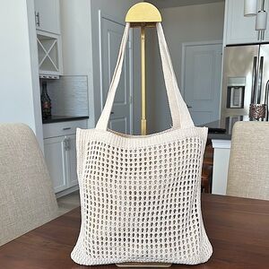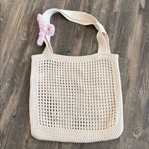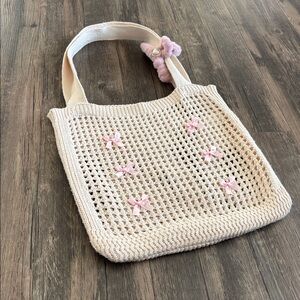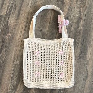 This elegant cream knit tote bag features charming pink accents, perfect for adding a touch of style to any outfit. Ideal for everyday use, this bag combines fashion with functionality. New without tags pre-loved condition.💕