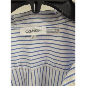 Calvin Klein women's blouse featuring a classic blue and white vertical stripe pattern.