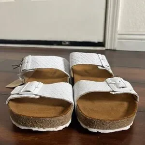 Keywords: Haflinger, Bio Andrea, White Sandals, Cork Footbed, Slide Sandals, Leather Slides, Arch Support, German Footwear, Comfort Shoes, Woven Texture, Adjustable Straps, Summer Shoes, Ergonomic, Birkenstock Style