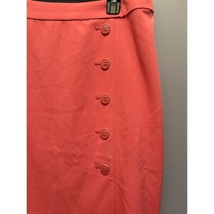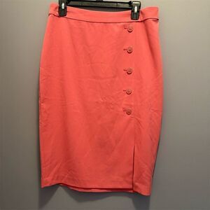 Keywords: NY & Company, women's skirt, size 12, pinkish coral, straight skirt, pencil skirt, button-front, side slit, casual wear, knee-length, machine washable, all seasons, solid pattern, polyester blend.