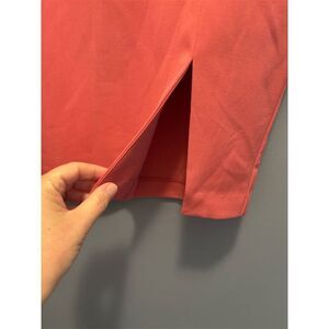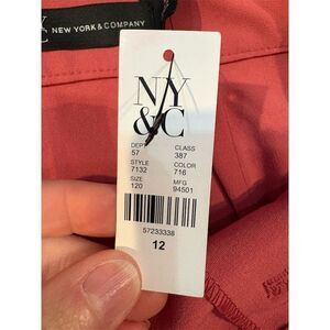 This NY & Company skirt is a women's size 12, straight and pencil style, in a pinkish coral color. It features a button-front closure and a side slit, offering a casual yet stylish look suitable for various occasions. Made from a blend of polyester, rayon, and spandex, it is knee-length and machine washable, making it ideal for all seasons. Perfect for casual outings or a day at the office. The skirt is new with tags.