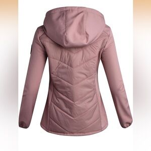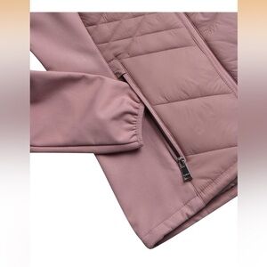Stay stylish and warm with this beautiful Bebe hybrid jacket. Featuring a mix of quilted insulation and softshell panels, this jacket offers a flattering, slim fit without sacrificing mobility. The soft "Dusty Rose" color makes it a versatile piece for any winter or fall wardrobe.