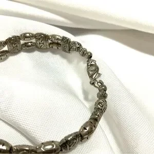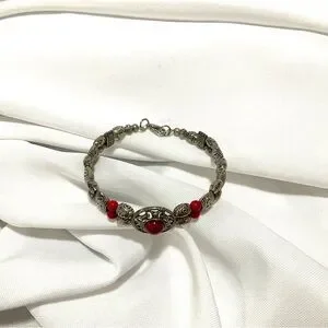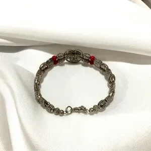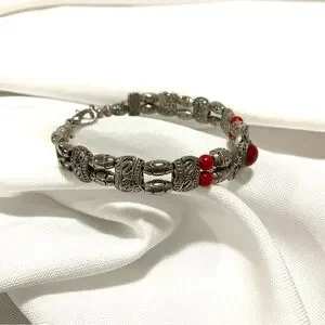 This listing is for a Tibertan Silver-Tone Bracelet with a Red Cabochon Ball and Red Coral colored side beads. It measures a size 7 1/2. It has a lobster closure. It’s in like new condition.