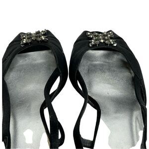 Stuart Weitzman black satin open toe rhinestone embellished heels size 8.5 N. Slingback strappy design. Special occasion. Very good condition. Heel height 2”.