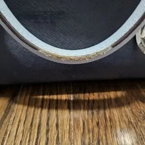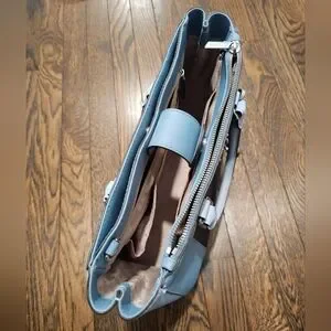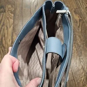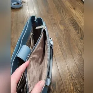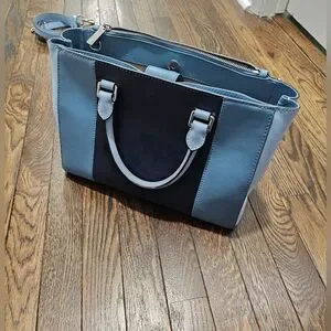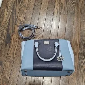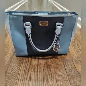 Michael Kors 2-toned blue purse. 3 capartments. 1-zippered on side, 1 large open with one magnetic snap in middle, smaller side with magnetic snap on other side. Inside middle section has zippered section and 4 open pouches (2 that fit cell phone). Removable strap. 2 main handles have some wear on leather detail as shown in pictures and a few small marks otherwise great condition.