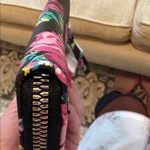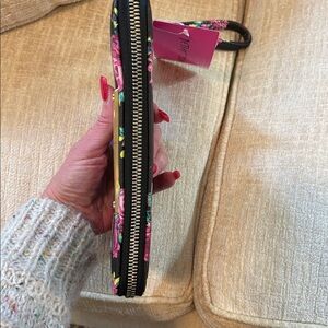 Chic wristlet featuring vibrant pink and green floral pattern. Stylish black background. Perfect for any occasion. New with tags.