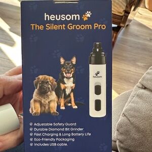 Heusom Silent Groom Pro pet nail grinder. Features low noise and vibration. USB rechargeable and cordless operation. Ideal for both large and small dogs. Found that although it is fairly quiet I still can’t get near my dog with it. Never used.