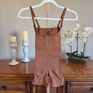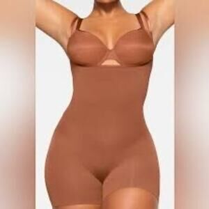 SKIMS Seamless Sculpt butt lifting open bust bodysuit in the discontinued color Bronze. High-compression shapewear designed to sculpt, smooth, and enhance curves with targeted compression through the waist, abdomen, and hips. Open bust design allows you to wear your own bra. Features adjustable straps and contoured, butt-lifting construction for a smooth, lifted silhouette under clothing. This color is no longer available from SKIMS. New without tags. Never worn. No flaws noted. Size Medium. Color Bronze. Brand SKIMS. Made in Vietnam.