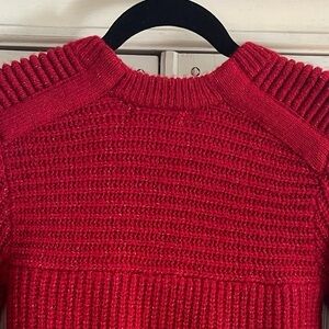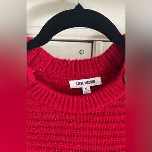 Red Steve Madden sweater with white thread blend. New with tags from sample sale. Winter 2023. Crewneck with buttons at shoulders for detail. Hits at hips. This is a fitted piece, runs on the small side. Size small. Offers welcome!