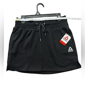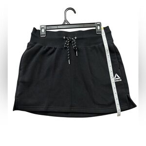 Stay comfortable and stylish with this Reebok black athletic skort. Made with soft, breathable fabric, it features an elastic ribbed waistband with adjustable drawstring for a perfect fit. The Reebok logo on the side adds a sporty touch. Ideal for workouts, running, tennis, or casual wear.