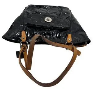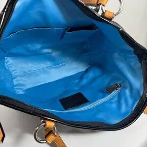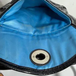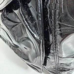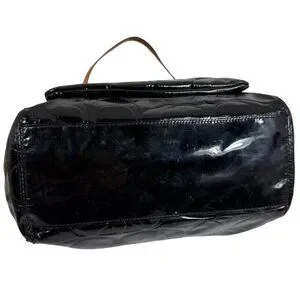 Patent leather has some scratches and lint from a wipe down. Interior fabric has marks, most noticeable ones are shown in photos 14, 16 & 17. Bottom width: 10.5", Height: 11", Depth: 4", Handle drop: 10".