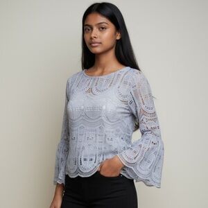 I MADELINE long sleeve small crocheted top bell sleeves NWT baby blue